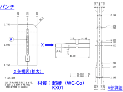 その他の加工事例 超硬WC-Co製 パンチ金型 材質 材質:超硬WC-Co、KX01(エバーロイ製) 寸法 5.5㎜ 精度 詳しくはこちら SUS440Cバフ仕上げクランパー 材質 SUS440C 寸法 12mm×5mm×14mm 精度 ±0.01 詳しくはこちら SUS303製吸着ヘッド 材質 SUS303 寸法 20x9x17 精度 ±0.02 詳しくはこちら SUS404C製ガイド 穴開け加工事例 材質 SUS440C 寸法 抜き穴16×18 精度 ±0.01 詳しくはこちら SKD11製 カッター斜め加工事例 材質 SKD11 寸法 5×15×40 精度 ±0.01 詳しくはこちら t=0.3の掘り込み切削加工事例 材質 SUS440C 寸法 Φ12 t=0.3 精度 ±0.005 詳しくはこちら ジュラコン(POM)製 コネクタ・半導体製造用搬送パレット 材質 ジュラコン(POM) 寸法 3X100X300 精度 ±0.05 詳しくはこちら HPM75(非磁性材)製 半導体業界向けパレット 材質 HPM75 寸法 10×150×150 精度 ±0.01 詳しくはこちら MCナイロン製コネクタ向けチャック 材質 MCナイロン 寸法 15×15×30 精度 ±0.05 詳しくはこちら PEEK製コネクタ向けチャック 材質 PEEK 寸法 15×15×30 精度 ±0.02 詳しくはこちら ダイセット式 絶縁検査治具 材質 プローブホルダー:スミカスーパー ワークガイド、受け台:鉄 寸法 精度 プローブピッチ0.07 詳しくはこちら ダイセット 端子圧入治具の設計製作事例 材質 パンチ:SKD11 寸法 精度 詳しくはこちら □1mmの精密加工事例‐直彫りで逃がし加工・面取りをした切断パンチ 材質 SKD11 寸法 7×20×50 精度 ±0.01 詳しくはこちら SUS440製ガイドの直彫り深穴加工 材質 SUS440c 寸法 15×20×30 精度 ±0.01 詳しくはこちら 電子部品向け狭ピッチ端子ガイド-超硬への切削加工品 – 材質 超微粒子超硬 寸法 19.5×12.0×6.5 精度 ±0.01 詳しくはこちら スミカスーパーS1000 φ0.23mmの微細穴加工事例 材質 超硬エンドミル 寸法 Φ10×30 精度 ±0.01 詳しくはこちら